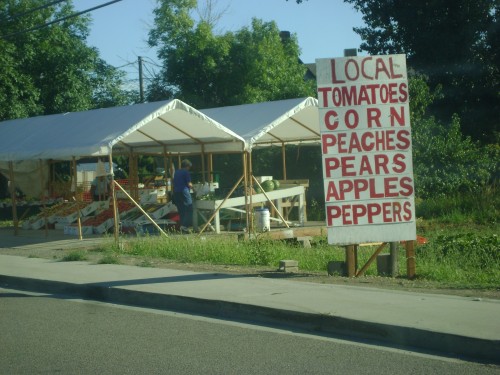 One of the most amazing things—for me–about summer, is that around just about every corner, we are blessed with fruit and vegetable stands. So on the off chance that the gardens don’t do so well, we can always run down the street and grab a bushel of tomatoes to can…or pears, or peaches, or apples. This one is about a block away from our house.